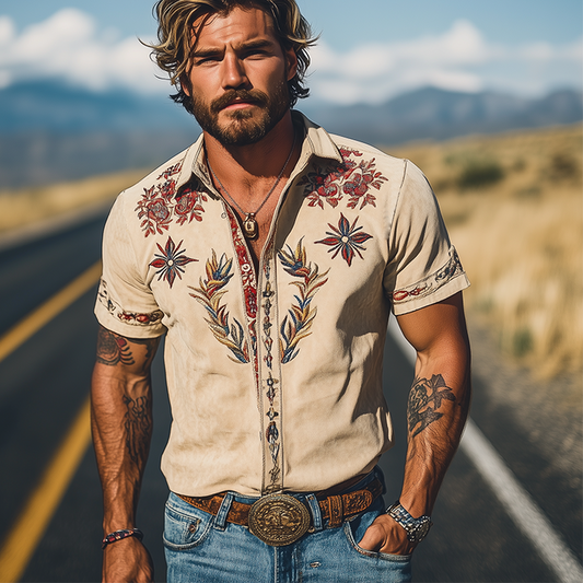 【24-hour shipping out】Men's Spring/Summer Fashion Retro Western Style Suede Embroidered Short Sleeve Shirt MTA1533D2K