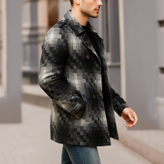 Men's Classic Graphite Check Double-breasted Faux Wool Short Coat MTA0848K8U