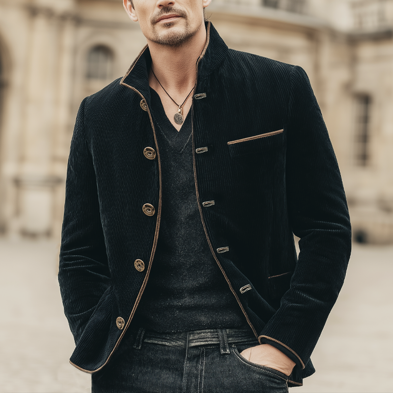 The Men's Classic Corduroy Stand Collar Multi-Button Jacket is a sophisticated blend of style and functionality. Crafted with fine corduroy fabric, this jacket is a perfect choice for those looking to add a touch of classic elegance to their wardrobe. The stand collar and multi-button detailing enhance its vintage appeal, making it suitable for various occasions.