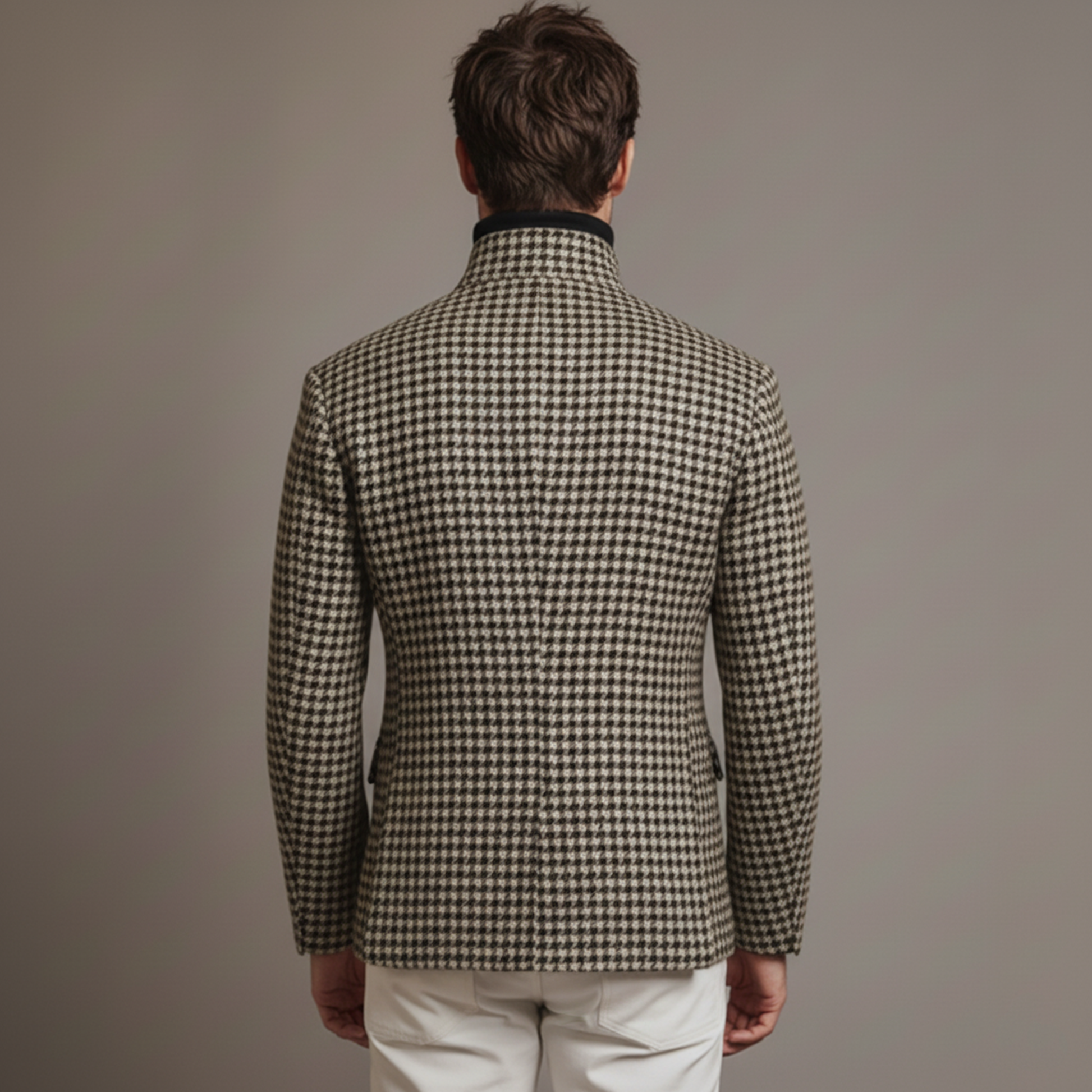 The Men’s Classic Retro Stand-up Collar Slanted Placket Metal Button Faux Houndstooth Wool Jacket blends timeless tailoring with a contemporary edge. Featuring a structured stand-up collar, a distinctive slanted placket with metal buttons, and a faux houndstooth wool texture, this jacket delivers refined warmth and a polished silhouette suitable for smart-c casual to semi-formal ensembles across transitional seasons.