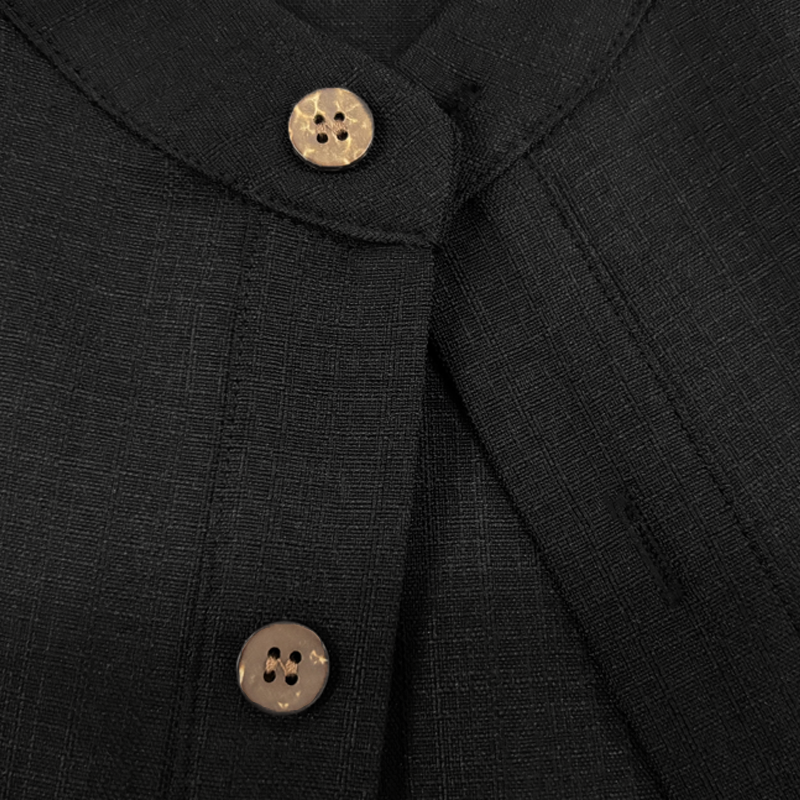 A front button placket allows for easy wearing and adjusting, while matching buttons enhance the shirt’s sleek look. -
